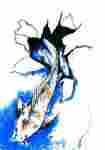 2004Ingekleurde houtskooltekening van een koikarper die als een chinese acrobaat door een stuk papier springt