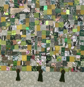 2020Papiermozaiek met daarin verwerkt papier van chinese gelukskoekjes en 6 geluksmunten